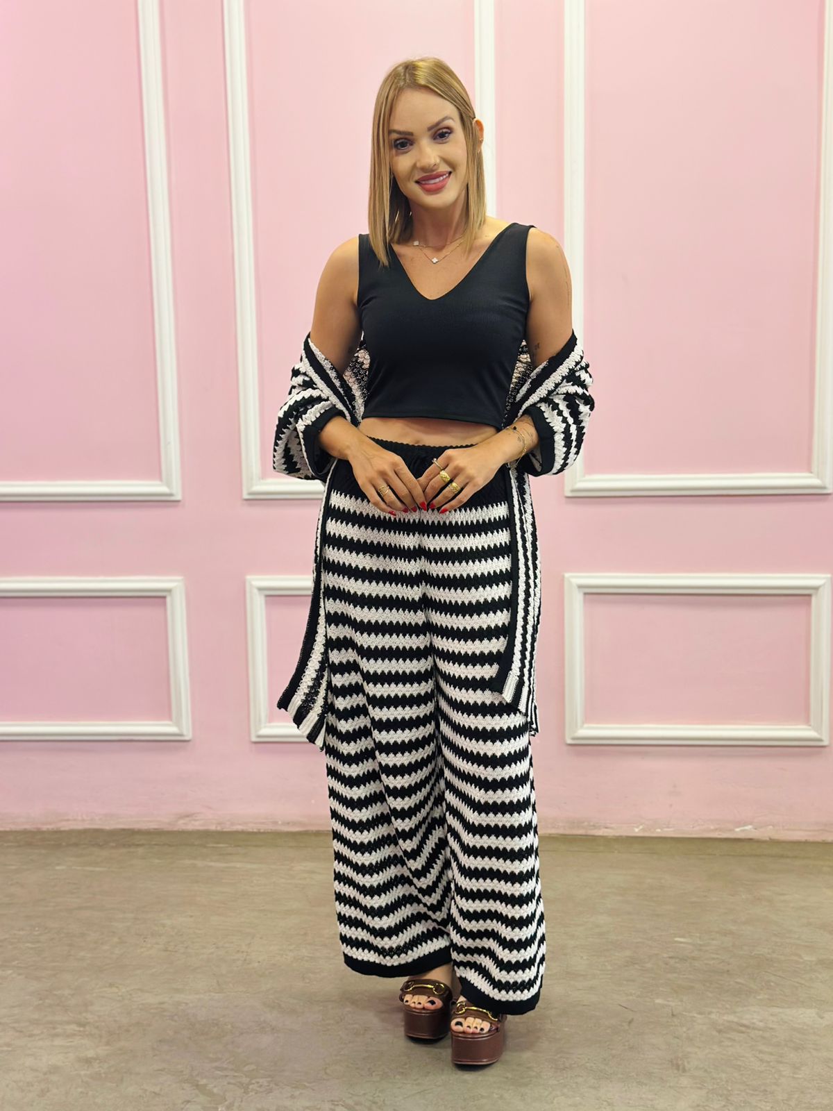 Em tricot, com estampa moderna em listras, é aquele look estiloso e confortável na medida certa. Disponível em duas cores, veste do 36 ao 44, perfeito para usar junto ou separado em várias produções.